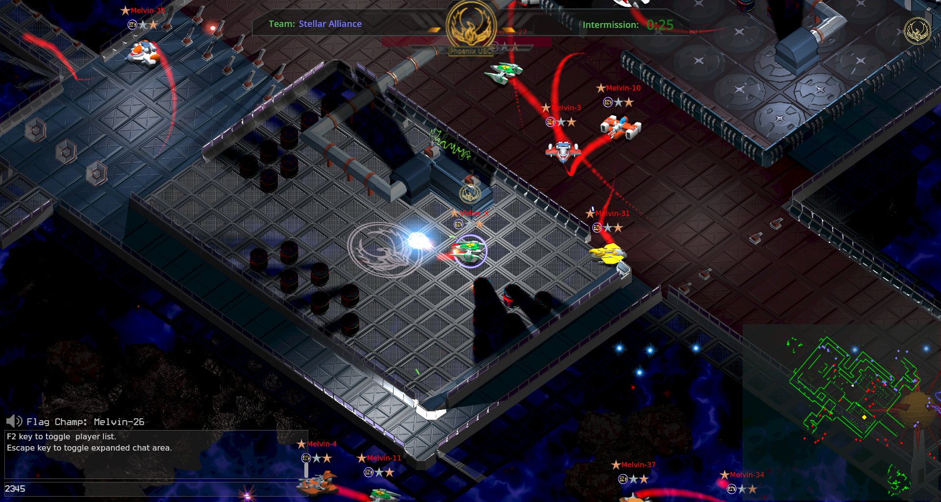 Hi, This is an online test of the Phoenix USC server and client as viewed from a client with the server hosted on on a VPS, actual online game play. Here you will see (video) a complete capture the flag match start to finish as 80 server controlled bots and I battle for the flag. This online test of the pre-alpha version of Phoenix USC marks a milestone in development. This is a very short match which is rare but better for video length. I am very happy with the network and tween/smoothing performance and the overall server and client performance. Very fun to play even at this early stage. I will be updating on possible pre-alpha client release dates. In general these first early test will be handled in our discord server so why stop by and say hello. Below are images that help describe how a capture the flag match works. Between CTF (capture the flag) matches the system holds a 60 second intermission. You can see in the images below the HUD showing Intermission status and the Last winning team. After the intermission ends the match begins and the HUD match timer is gray and not counting down and the team status shows unclaimed flag. Once a team player / bot touches the flag the match countdown timer will start, yellow if your team possesses flag and red if not. The team currently holding the flag will be shown in the HUD's team status. A match will range in time played. Once a challenging team player or bot touches the flag the countdown timer will be reset to 1:30. Once the countdown timer reaches zero that team wins. I hope you take a look at the video as it really shows it all very well. I will have more updates soon. More soon. Vidiot_X Visit here for more information: Phoenix USC Website: https://www.phoenixusc.com Phoenix USC Discord: https://discordapp.com/invite/gRSqcQG