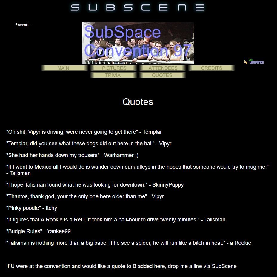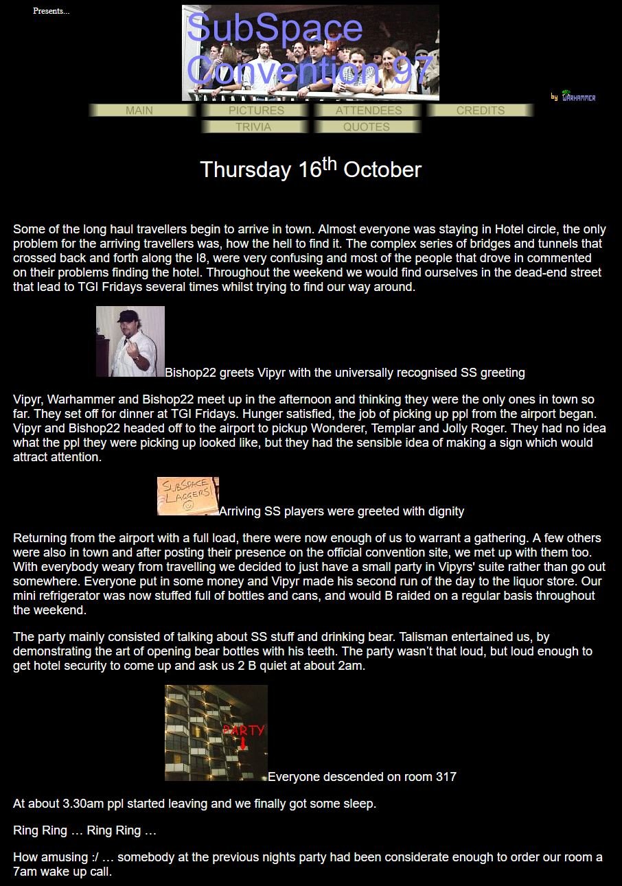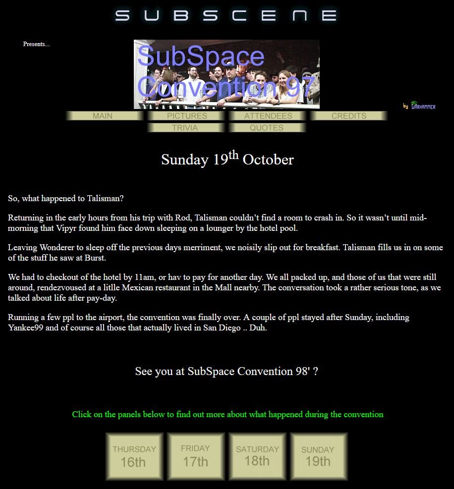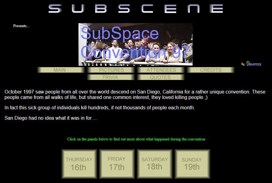 ironbuket Posted Saturday at 03:06 AM Author Report Posted Saturday at 03:06 AM IRL Convention 01 – October 1997 San Diego California I originally posted a news story about this convention on a news website called Subscene in 1997 (my player name was Warhammer back then). I think maybe I ran that website, but honestly it has been so long I cant recall the details. I had the intention of copying the story text and pasting it in here like a normal post, but the original story has some images posted with related text next to them making that difficult to pull off recreating it here I decided instead to just post images of the original story as it appeared on the website when it was published. Sorry for the inaccessibility but I think this is the better choice I’m also sorry for putting you through the way I wrote back then, I was young and thought it was cool at the time 😅