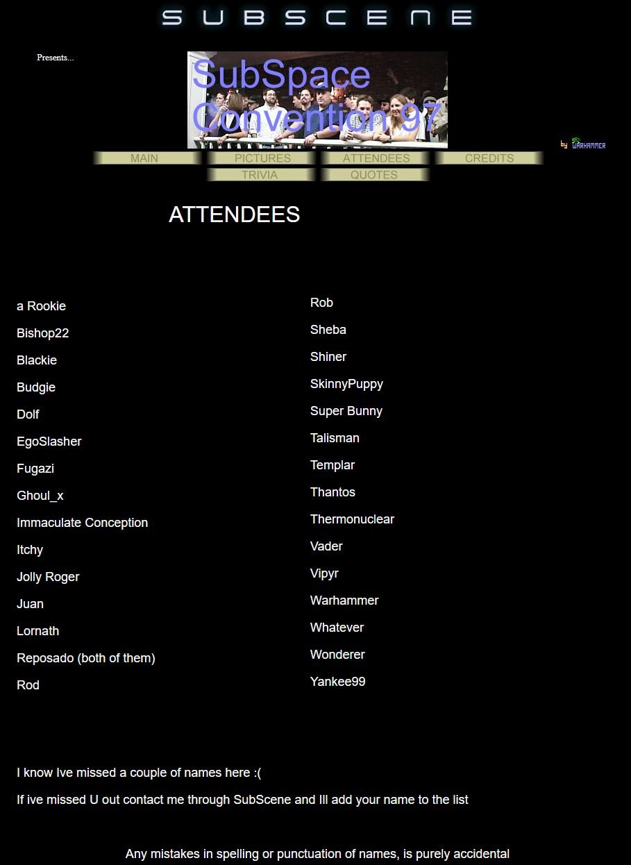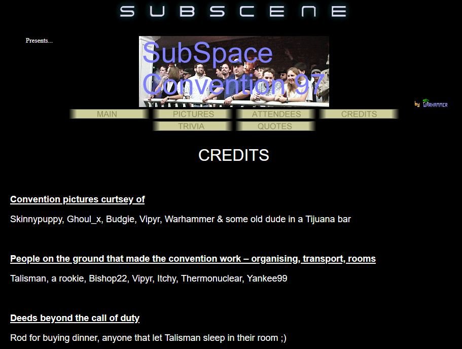 ironbuket Posted Saturday at 03:03 AM Report Posted Saturday at 03:03 AM I found info from the first ever Subspace convention on an old hard drive a few years back and I thought I would post details of it to the community. If you have information on any other past IRL conventions, please feel free to create a post below this and put in any detail you may have